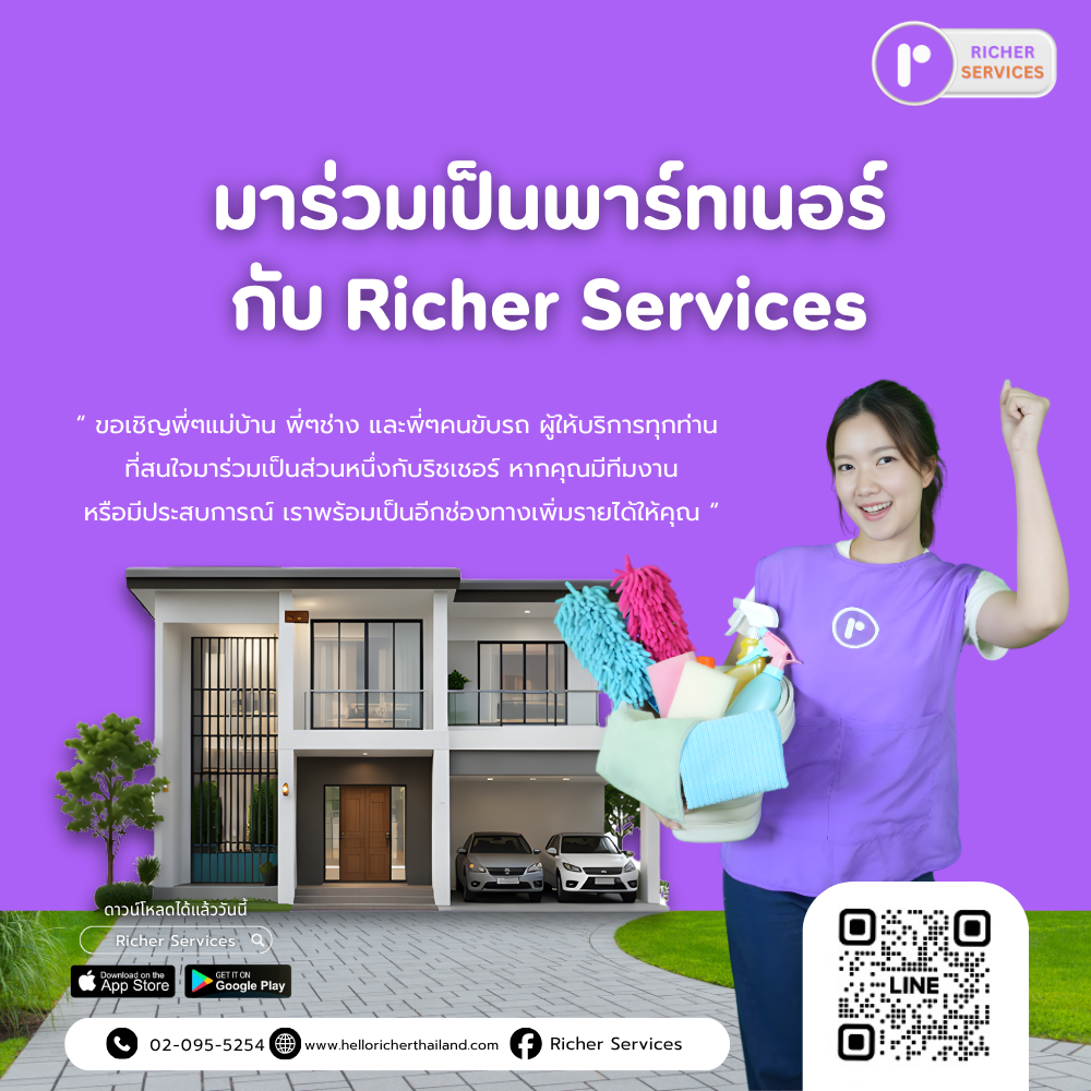 เราคือผู้ช่วย ที่ทำให้ชีวิตคุณง่ายขึ้น! ที่ Richer Services เราเชื่อว่าความสะอาดและความสะดวกสบายคือปัจจัยสำคัญในการทำให้ชีวิตดีขึ้น ไม่ว่าคุณจะต้องการ แม่บ้านมืออาชีพ, บริการ Big Clean, ล้างแอร์ หรือ รถพร้อมคนขับ เรามีครบทุกบริการที่ตอบโจทย์ทุกความต้องการในชีวิตประจำวันของคุณที่ RICHER SERVICES ความสะอาดและการบริการที่ดี ไม่ใช่แค่บริการ แต่เป็นความมุ่งมั่นของเรา